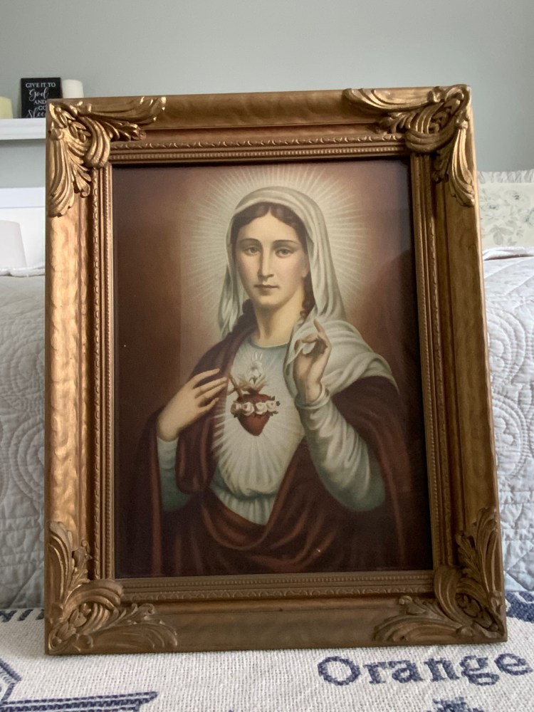 For decades, this picture of Mary has been hanging in the entryway of my parents’ home – my childhood home. I would always walk past it, glancing but never really studying it. I was curious about the sword, but never so much that I looked closer or researched why her heart was pierced in this way.