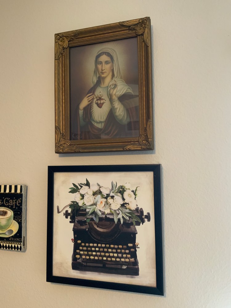 After reading about the picture of the Immaculate Heart of Mary I learned that her heart was wrapped in white roses, symbolic of her purity. (aleteia.org) Today I noticed that the image of the typewriter hanging below her picture also has white roses, symbolic of my hope to share her story.
