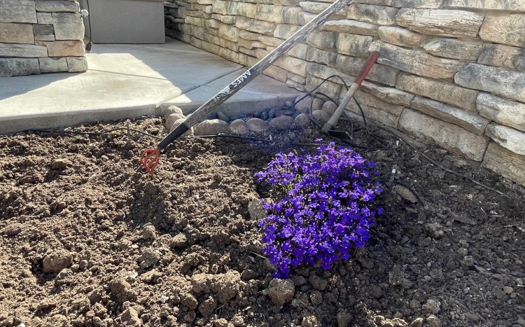 We were surprised when we started this project a month or so ago that the purple flowers you see in the photo below started to bloom without any assistance from us. We had stopped watering because all of the surrounding plants had died off. We hadn’t fertilized or pruned them. But nevertheless they were flourishing at the foot of Mary. My husband left them in place while prepping the area for what comes next, and they’ve continued to grow and to bloom.