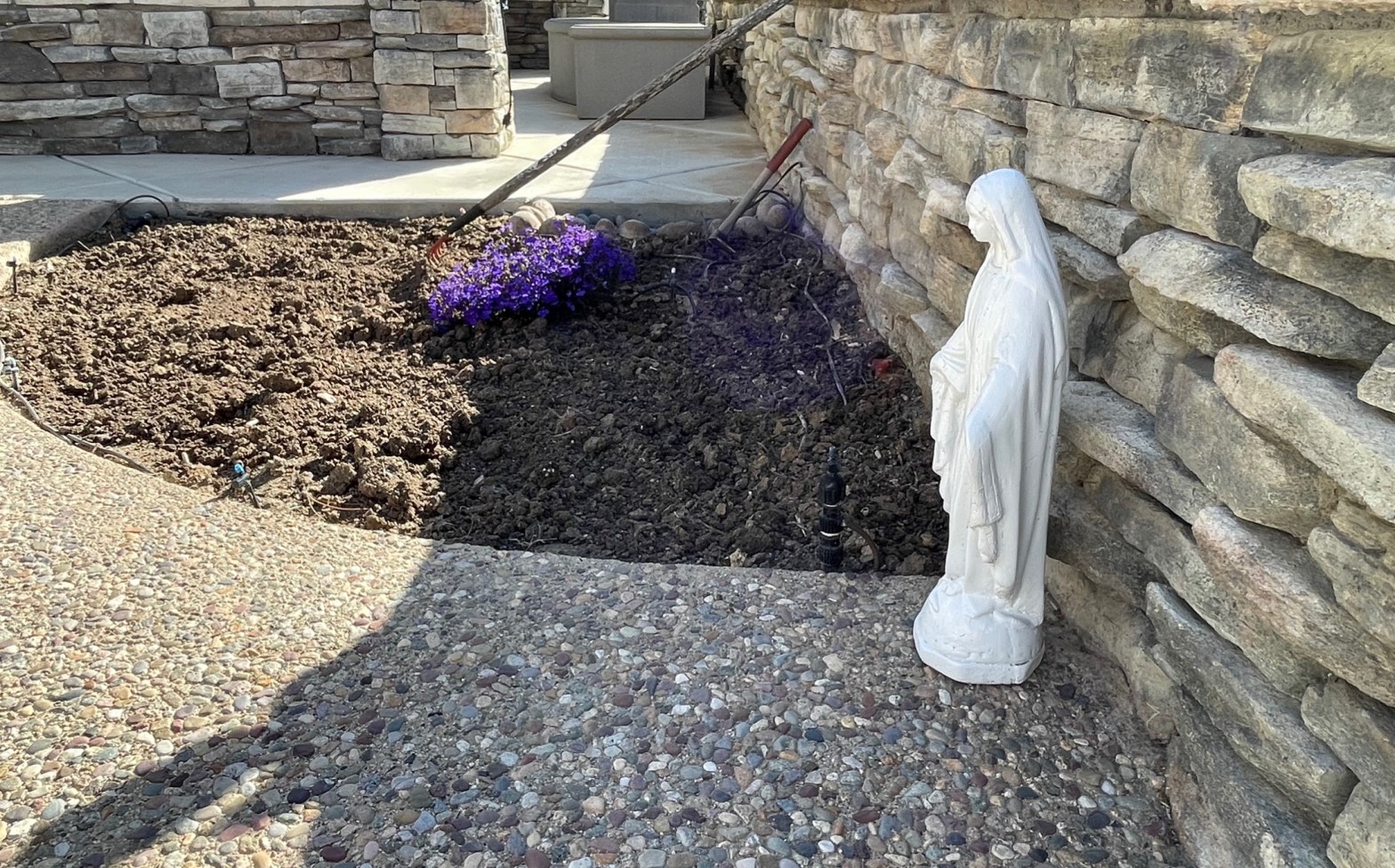 Today, on Good Friday, I was reflecting on the scene of our project. The statue of Mary is resting near her backyard home as she waits to be returned to the grotto. The blooming flowers’ purple color is in sync with the Liturgical Calendar’s color of purple for Lent. (The United States Conference of Catholic Bishops refers to it as “violet.”) And we are toiling during the Triduum, waiting for the work to be done so we can bless the statue with holy water and enjoy this special place for Our Lady.