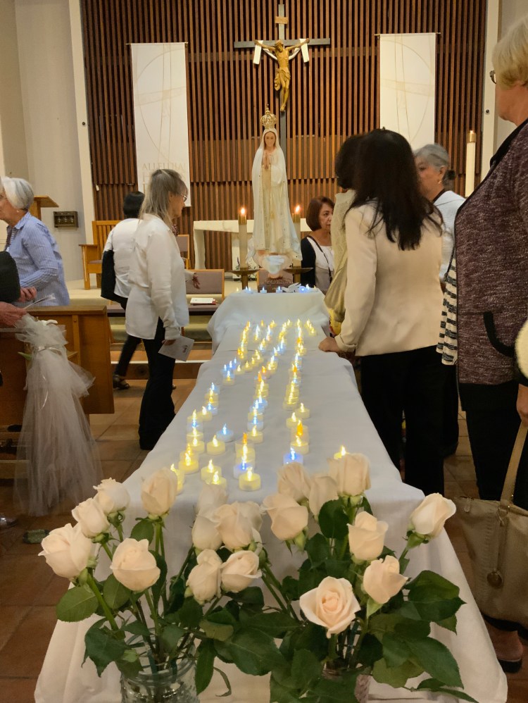 Upon entering the church, the rest of us were given a battery-operated votive candle that represented our petitions. The entire community processed into the church, placed their candles in front of the statue of the Blessed Mother, and then took their seats in the pews.