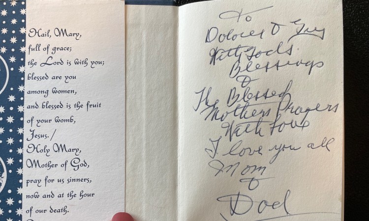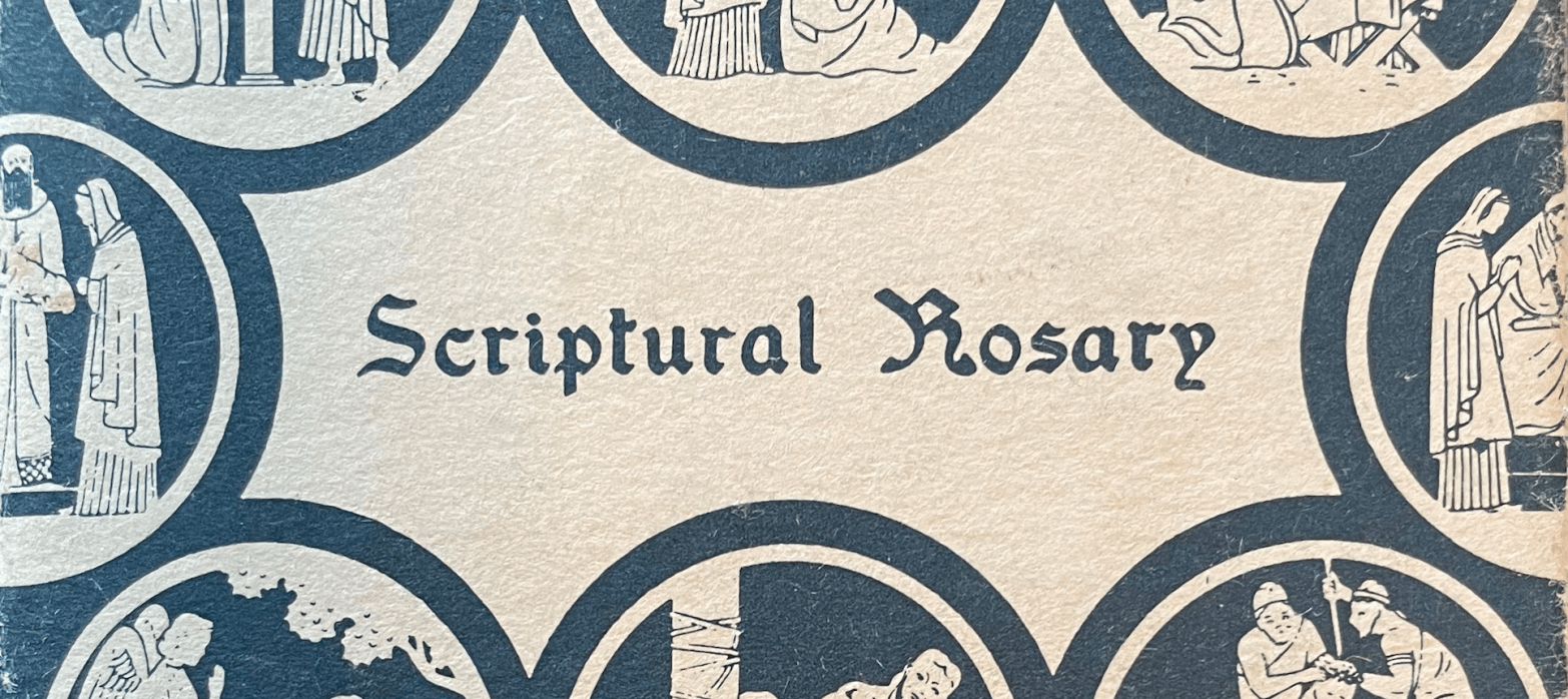 There are numerous books offering scriptural rosaries available online. I was lucky to discover “Scriptural Rosary” among my mother’s collection of prayer books after she passed away. Inside, I found the inscription by my grandfather. (See below.)