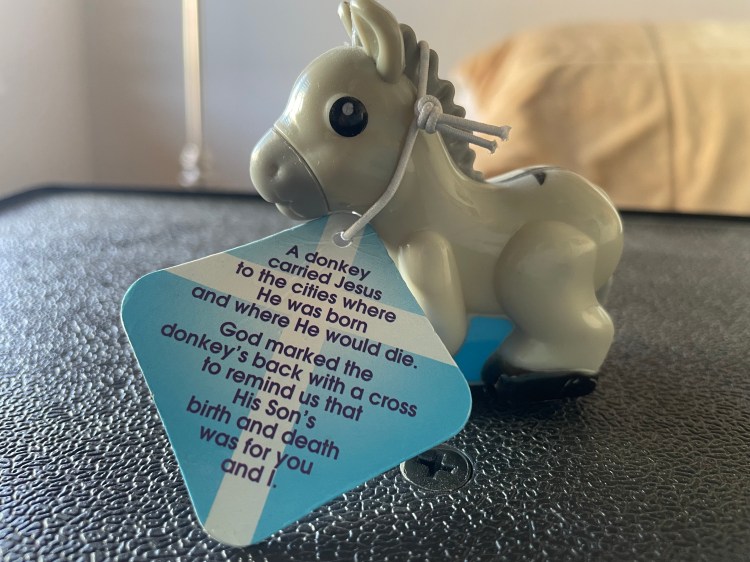 My husband brought me this cute plastic donkey that succinctly shares the legend on its tag. (I think he was hoping that his little gift would satisfy me and that we wouldn’t have to get the real thing.) If you look closely, you can see the cross on its back.